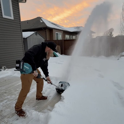Uniquely, Makita also offers this Snow Thrower attachment: The business end is 12" wide and can handle a 6" depth of snow at a time. Tiltable vanes on the inside let you control whether you want to throw the snow to the left, to the right or straight ahead.